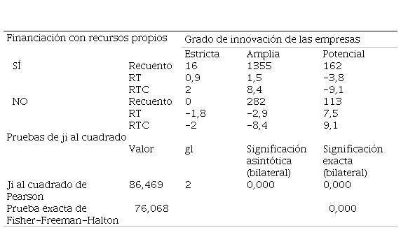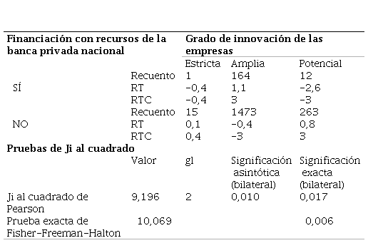 Fuente: elaboración propia. Nota: RT: residuos tipificados, RTC: residuos tipificados corregidos, gl: grados de libertad.Table 7. Funding with resources from the national private banking sector according to degree of innovation