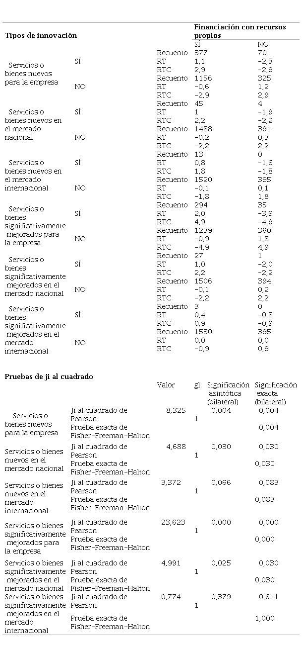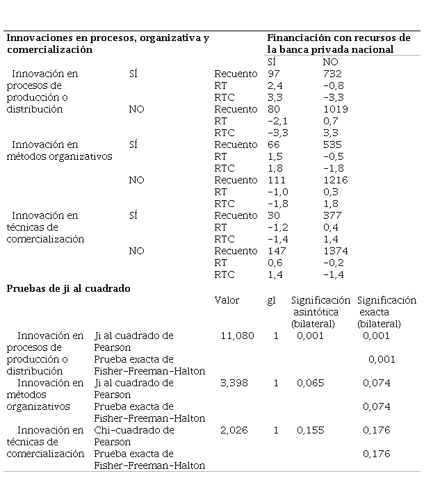 Fuente: elaboración propia. Nota: RT: residuos tipificados, RTC: residuos tipificados corregidos, gl: grados de libertad.Table 8. Process, organizational, and commercialization innovations according to funding with resources from the national private banking sector