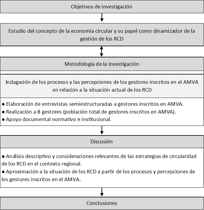 Con el fin de orientar la investigación y definir el alcance del presente artículo, se establecieron los siguientes dos objetivos: analizar el concepto de la EC y su papel dentro de la gestión de los RCD y examinar los procesos y las percepciones de los gestores de los RCD que se encuentran inscritos en la autoridad ambiental del AMVA.