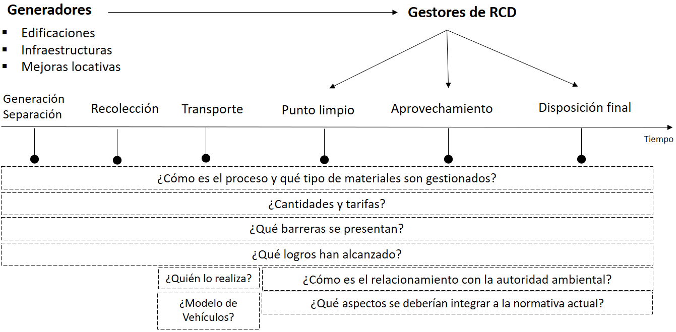 Las preguntas realizadas a los gestores inscritos en el AMVA fueron enfocadas en las etapas de generación, separación, recolección, transporte, almacenamiento (punto limpio), aprovechamiento y disposición final de los RCD. Las preguntas se encontraron direccionadas a conocer los procesos, tipos de materiales gestionados, las cantidades gestionadas y sus tarifas, información asociada al transporte, las barreras que se han presentado, los logros que se han alcanzado, el relacionamiento con la autoridad ambiental y aspectos asociados a la normativa actual de los RCD. En la Figura 2 se detalla la estructuración de las preguntas de acuerdo con la etapa y la función específica de los gestores.