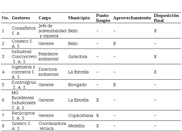 Para este estudio, se realizaron ocho entrevistas semiestructuradas a los gestores inscritos en el AMVA. Es de mencionar que los ocho gestores entrevistados conformaron la población total de las empresas inscritas en la autoridad ambiental en el año 2020. Por esta razón, las respuestas que se presentan en este artículo permiten comprender en muy buena medida la situación actual de la gestión de los RCD en el Área Metropolitana, ya que se indaga sobre las perspectivas y percepciones de todos los inscritos. En la Tabla 1 se especifican los gestores entrevistados.