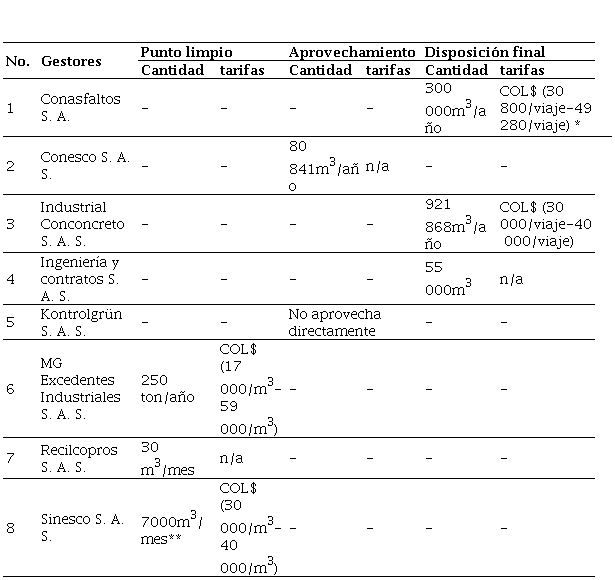 En lo referente a la disposición final, se hallaron registradas tres empresas: Conasfaltos S. A., Industrial Conconcreto S. A. S. e Ingeniería y Contratos S. A. S. Las dos primeras empresas tienen ubicadas sus escombreras al norte del Área Metropolitana y reciben solamente material de excavación y derivados pétreos de la construcción. Lo anterior se debe al tipo de consolidación del lleno que se encuentra realizando en sus antiguas plantas de extracción de materiales de construcción. En el caso de la empresa Ingeniería y Contratos S. A. S. se da una situación bastante particular, ya que esta empresa acudió a la figura de gestor de disposición final ante AMVA para gestionar los RCD provenientes de un proyecto de construcción que está a su cargo. De este modo, la empresa dispone su RCD en los mismos terrenos del proyecto. Con lo anterior, la empresa buscaba ahorrar los costos de transporte y los impactos ambientales de transportar estos RCD desde el sur del área metropolitana hacia el norte.