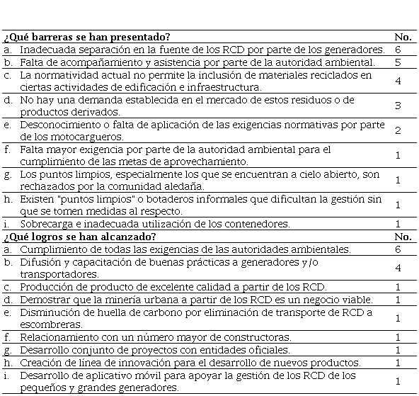 Con la finalidad de conocer las limitaciones y los avances asociados a la gestión que han venido realizando los diferentes gestores de los RCD inscritos en el AMVA, se indagó acerca de las barreras que han presentado y los logros que han alcanzado, incluyendo, también, consideraciones con respecto a la normativa y el relacionamiento con la autoridad ambiental. La Tabla 3 presenta las respuestas comunes más recurrentes entre los gestores entrevistados.