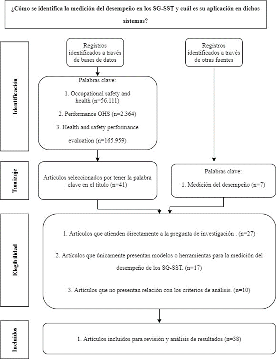 Se realizó una revisión sistemática, exploratoria (Manchado Garabito et al., 2009) en las bases de datos de artículos científicos (ScienceDirect, Scielo, Pubmed y Redalyc); de igual manera, se complementó con un proceso de escrutinio de referencias citadas de otros autores; y por último, se realizó consulta de literatura gris (revistas, sitios web y Google Scholar). El periodo de búsqueda corresponde a documentos publicados entre el 2002 y el 2021. Las palabras clave utilizadas para la búsqueda sistemática fueron performance y occupational safety and health, combinada con evaluation y OHS. En total, se definieron tres ecuaciones de búsqueda con las palabras occupational safety and health, performance OHS y health and safety performance evaluation. En cuanto a la literatura gris, se utilizó la palabra clave medición del desempeño del SG-SST en español y las referencias extraídas por otros autores fueron buscadas directamente en la fuente o en la base de datos de ScienceDirect. Cabe precisar que la revisión contempló textos publicados en inglés y en español, por dos motivos: en primer lugar, la mayor parte de producción académica en este campo de conocimiento se publica en inglés y, en segundo lugar, estos dos idiomas son de dominio de los investigadores participantes en la revisión sistemática.