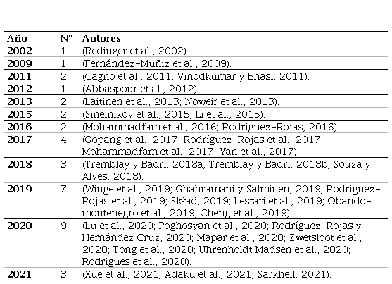 De acuerdo con la Tabla 1, el periodo de publicación de los artículos se encuentra definido entre el 2002 y el 2021, observándose un incremento en las publicaciones relacionadas con la medición del desempeño de los SG-SST en los años 2019 y 2020, con siete y diez documentos, respectivamente, y, para los años 2017 y 2018, se presentaron cuatro y tres documentos; mientras que en los años comprendidos entre el 2002 y el 2016, se presentaron entre uno y dos documentos, siendo menos la producción identificada para dicho periodo.