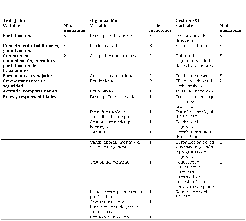 Para la subcategoría gestión de SST, la variable predominante fue compromiso de la dirección, con cinco menciones, seguida por mejora continua; cultura de seguridad y salud de los trabajadores; y, gestión de riesgos, los cuales obtuvieron tres menciones cada una; posterior a esto, se observaron las variables efecto positivo en la accidentalidad y facilita la toma de decisiones, con dos menciones cada una; finalmente, se identificaron los siguientes aspectos: comportamiento que promueve protección; cumplimiento legal del SGSST; gestión de la seguridad; lección aprendida de accidentes; organización de los sistemas de gestión y programas de seguridad; reducción o eliminación de lesiones y enfermedades laborales a corto y medio plazo; y, rendimiento del SGSST, los cuales fueron mencionados una vez por los autores.