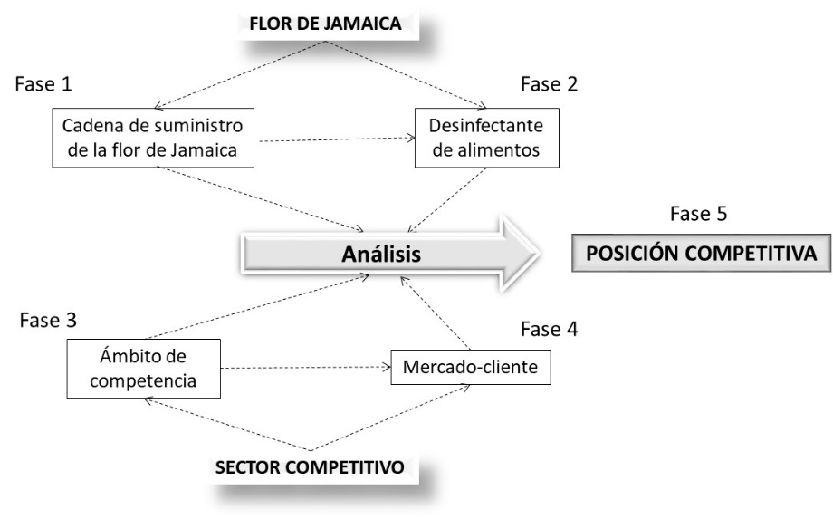 Para evaluar el desinfectante basado en los cálices de la flor de Jamaica, fue necesario conceptualizar y configurar una metodología con la cual se filtra y analiza información a través de diferentes herramientas que permiten conocer su posicionamiento competitivo y la identificación de los factores que más influyen. Es importante mencionar que se realizó la búsqueda de un procedimiento para hacer un análisis competitivo de productos naturales que beneficien a la salud, donde no se encontró una metodología que incluyera un análisis exhaustivo o se aplicaran herramientas como la caracterización del producto, la cadena de valor, las cinco fuerzas de Porter o un estudio de mercado, por lo que se desarrolló una configuración con estas herramientas. La búsqueda de información se realizó en diferentes bases de datos, consulta a expertos y estudios de campo.