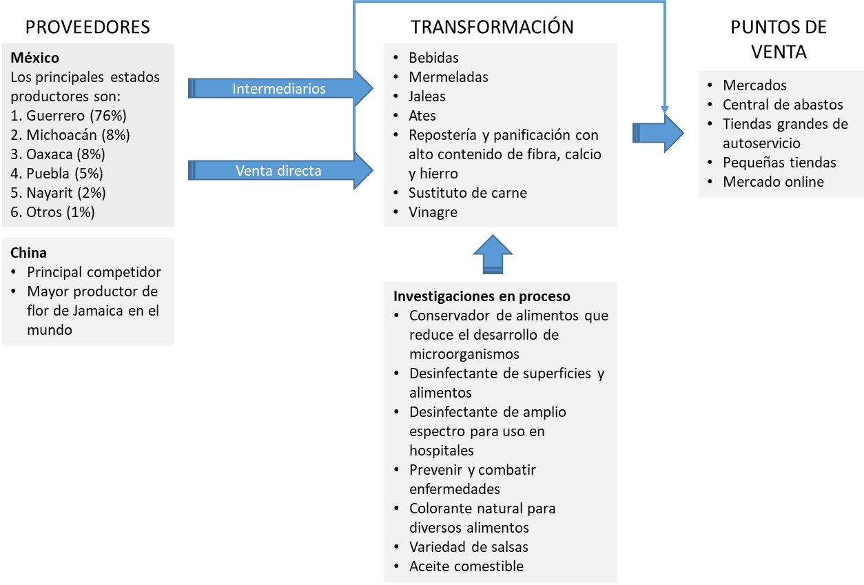 Para el desarrollo de la cadena de suministro de la flor de Jamaica, se deben considerar alianzas estratégicas entre el gobierno, centros de investigación, productores, procesadores, distribuidores y puntos de venta, para mejorar la calidad en la siembra, desarrollo de subproductos y extender las vías de comercialización, con la finalidad de mejorar los procesos que dan valor agregado y los beneficios socioeconómicos.