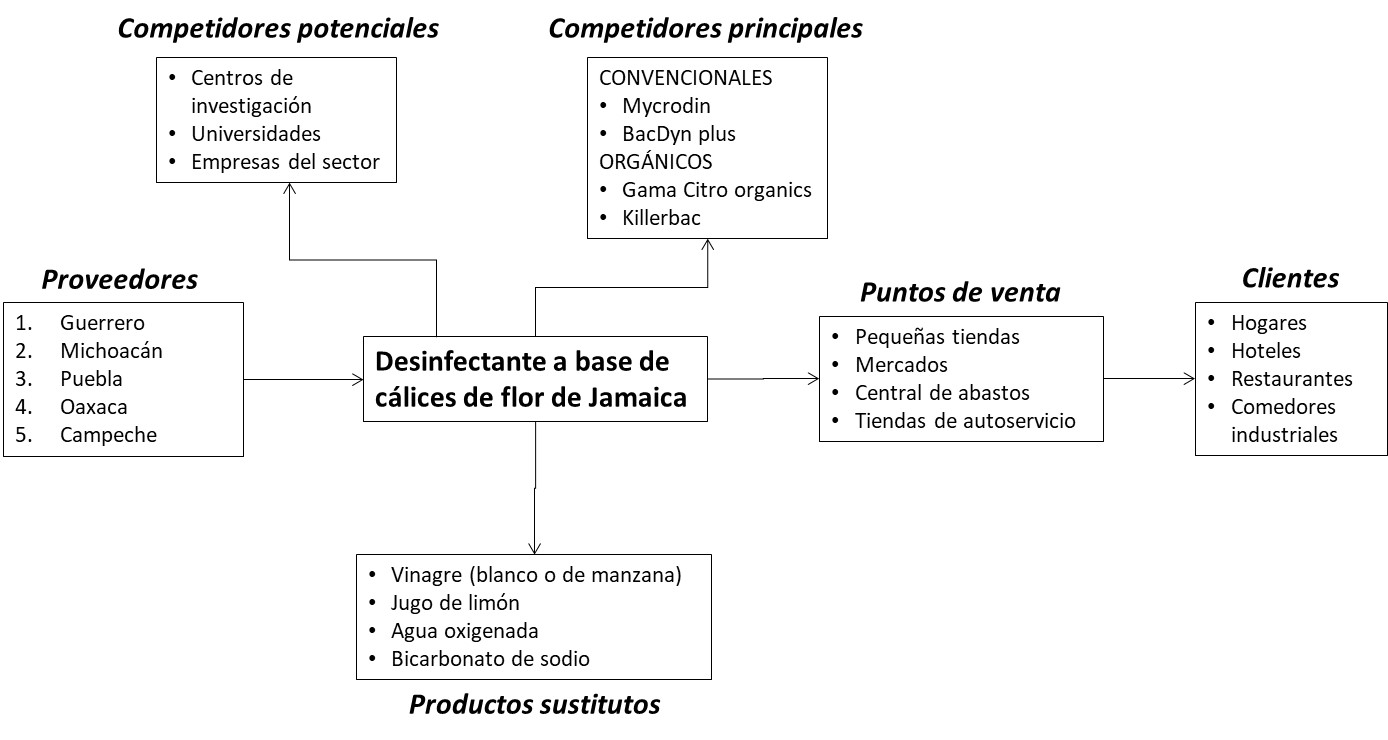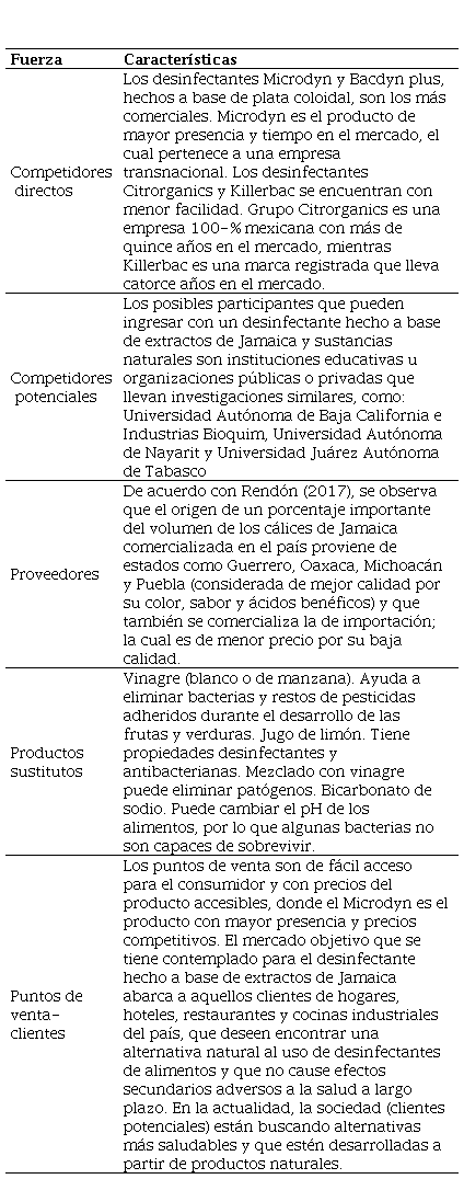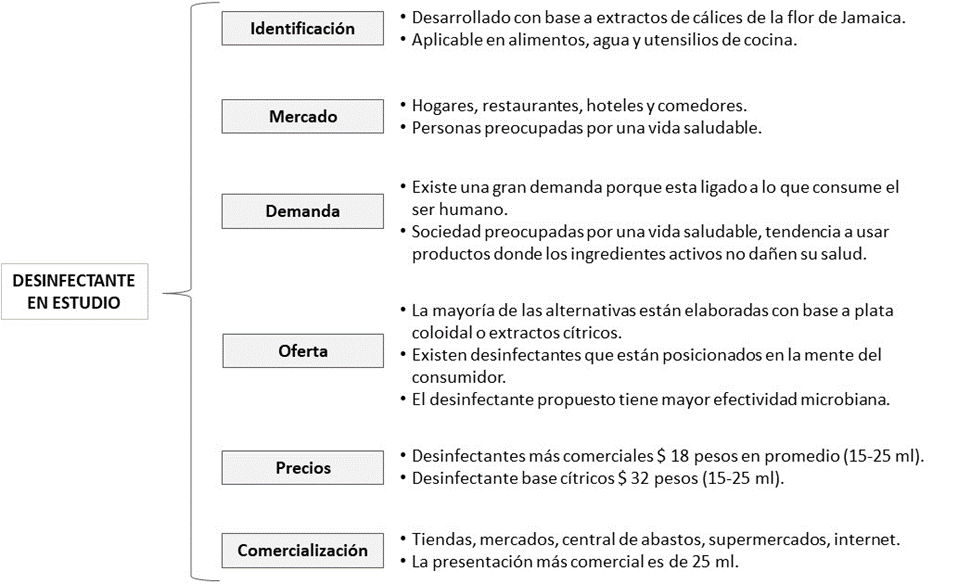 Es importante determinar los elementos que van asociados al mercado, comercialización y cliente final, por lo que se desarrolló la Figura 4, donde se muestran las características del desinfectante, el sector al que va dirigido, productos competidores que se ofertan y las necesidades de los consumidores. Para su desarrollo, se analizó información documental, trabajo de campo y la utilización de herramientas como la mostrada en la Figura 3 (cinco fuerzas de Porter). Cabe señalar que el consumidor potencial debe conocer acerca de los beneficios y uso del desinfectante en estudio, así como sus características, aplicaciones, ventajas que posee sobre la competencia y que el desinfectante esté hecho a base de extractos de cálices de flor de Jamaica y otras sustancias de origen natural.