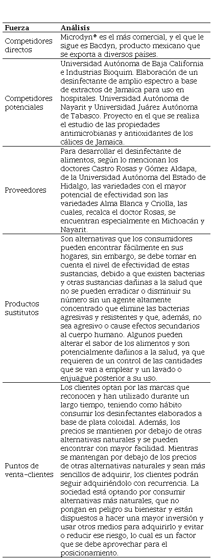 En este artículo de investigación se expone el análisis competitivo del desinfectante de alimentos, desarrollado a partir del cáliz de la flor de Jamaica, el cual contribuye al cuidado de la salud y a la prevención de enfermedades por su capacidad de disminuir la carga microbiana que se encuentra en alimentos, como frutas y verduras (Dirección de Comunicación Social -UAEH, 2019), para lo cual se desarrolló una metodología que permitió conocer las características del desinfectante y compararlas con productos de la competencia para identificar y analizar los factores que influyen en su sector industrial, mercado objetivo y cadena de suministro para fijar su posición competitiva de acuerdo a las condiciones en México, con la finalidad de reducir la incertidumbre en el momento que se introduzca.
