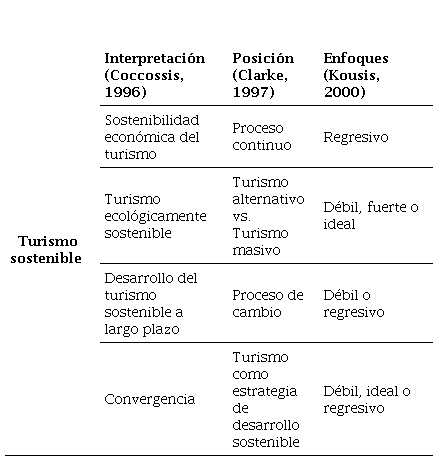 Esas razones demuestran la necesidad del concepto de sostenibilidad aplicado al turismo, el cual se fundamenta en la práctica de estrategias innovadoras, con fines de la preservación de estos espacios, integrando los aspectos ambientales, socioculturales y económicos, logrando la satisfacción, tanto de las necesidades de los visitantes, como las de la industria y del entorno de dichas localidades por medio de prácticas que contribuyan a su crecimiento. (OMT - PNUMA, 2005). Para complementar la idea anterior, la Tabla 1 presenta la perspectiva de distintos autores respecto a «las interpretaciones y alcances del turismo sostenible» (Bertoni, 2008, p. 158).
