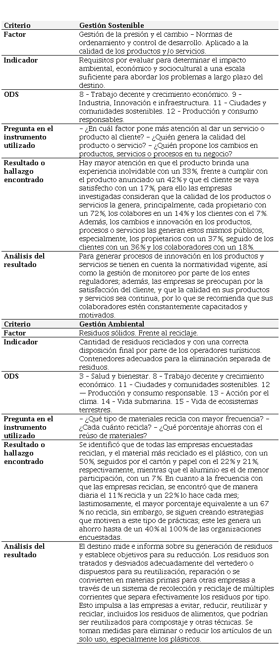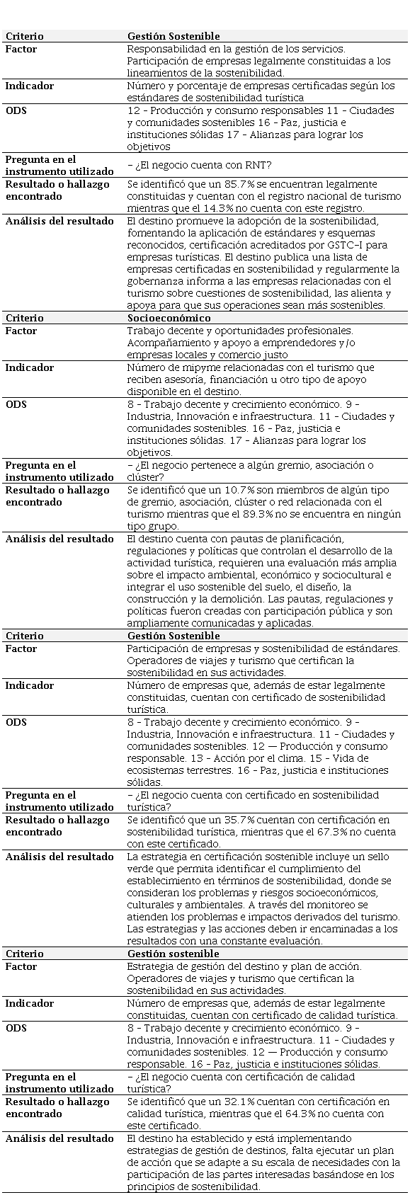Para analizar los hallazgos encontrados, y sin el ánimo de comparar, pero sí de reconocer y presentar cuáles son las prácticas en materia de sostenibilidad que se identifican en las mipymes de cada municipio, la presentación de resultados se realizó de la siguiente forma: se tomó como parámetro los criterios para destinos de sostenibilidad ambiental del Consejo Global de Turismo Sostenible -GSTC, por sus siglas en inglés- (GSTC, 2019)4, el cual señala la siguientes estructura de criterios: a) Gestión sostenible, b) Sostenibilidad socioeconómica, c) Sostenibilidad cultural y d) Sostenibilidad ambiental. Con base en estos se determinan los indicadores, además, la relación a la contribución de la Agenda 2030 para el Desarrollo Sostenible de los diecisiete Objetivos de Desarrollo Sostenible -ODS-. A continuación, se hace la relación para Jardín (ver Tabla 6).