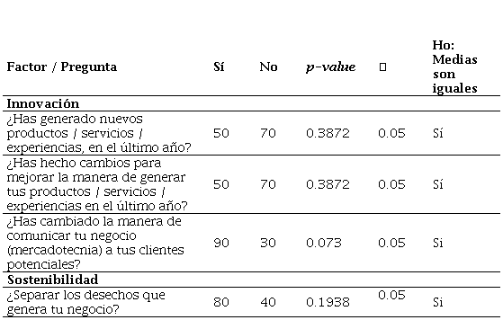 Hay que reiterar que en la encuesta aplicada en Tepotzotlán a ciento veinte mipymes relacionadas con el sector turismo, cuya finalidad fue medir sus prácticas actuales en torno a innovación, sostenibilidad y calidad, utilizando un cuestionario de diez preguntas, cuatro con una medición no paramétrica y seis con parámetros de proporción, aplicando la prueba de los signos para datos no paramétricos, se establece la hipótesis nula, afirmando que las medias de las respuestas son iguales, es decir, 𝛨0:𝜇1 = 𝜇2, lo que mostraría que no hay diferencia entre las respuestas obtenidas. Se considera un valor de significancia ∝=5% (ver Tabla 8).