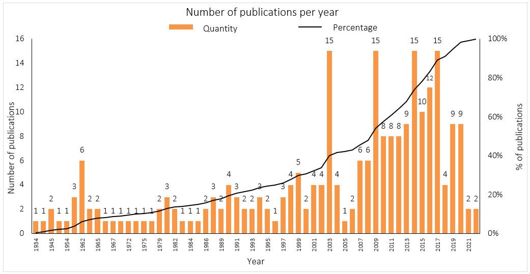 Figure 2 shows the number of publications per year. As observed, scientific production in the field varied between 1934 and 2018, exhibiting a cyclical behavior during the period under analysis. The years with the most publications (15 each) are 2003, 2009, 2014, and 2017, and those with the least publications (1 each) are: 1966 to 1978 and from 1983 to 1985. Additionally, even though the number of publications has fluctuated over the years, there has been an increased interest in the field.
