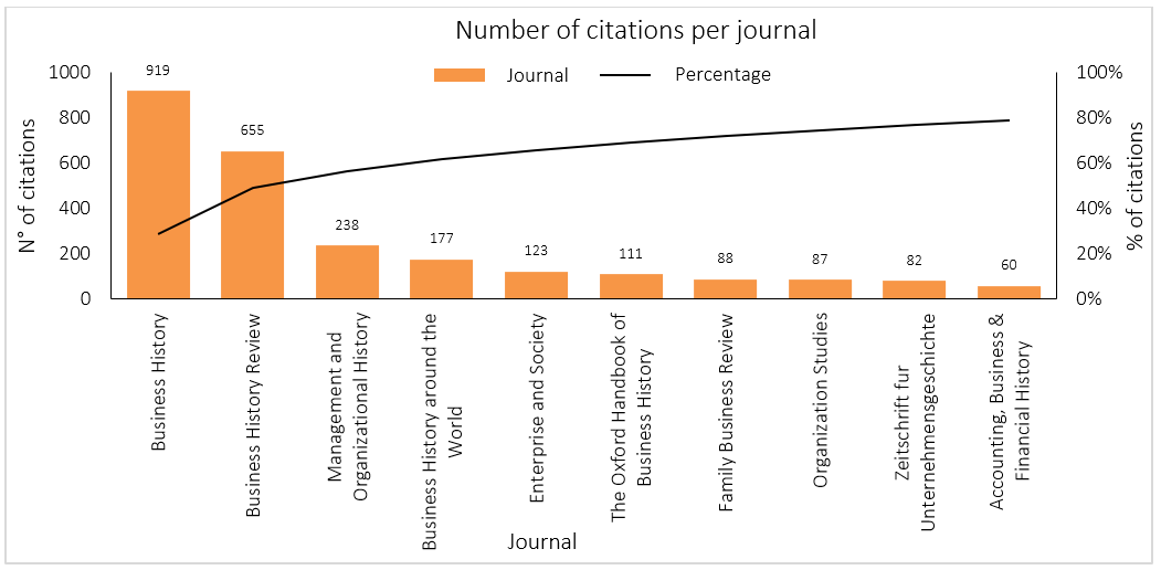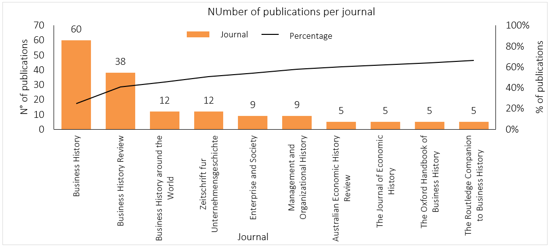 The findings of studies in the field are often disseminated through scientific or technical publications such as articles, books, conference proceedings, and patents, which are considered primary sources of information. In this regard, Figure 3 presents the ten journals with the highest number of publications in the field. As observed, Business History is on the top of the list with 60 publications, followed closely by Business History Review with 38 publications. This information is relevant when it comes to evaluating disparities in terms of coverage across journals.