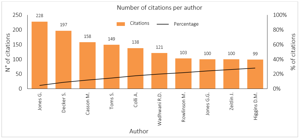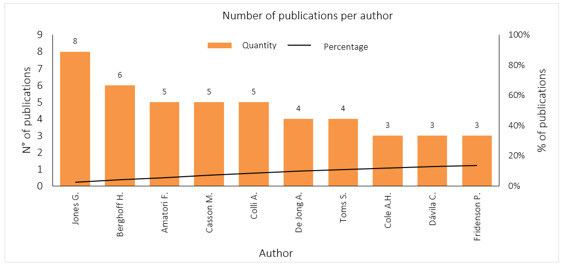 Figure 4 shows the ten authors with the highest number of publications in the field. As can be seen, Jones G. is on the top of the list with 8 publications, followed by Berghoff F. with 6 publications, and Amatori F., Casson M., and Colli A. with 5 publications each. Importantly, as stated by Bordons and Zulueta (1999), the productivity of authors depends on a number of factors that can be divided into two categories: 1) personal traits (e.g., intelligence, perseverance, ability) and 2) authors’ surroundings or context (e.g., influence of prestigious colleagues, ease of obtaining information, discipline in which they work, prestige of the institution to which they belong, financial endowment).