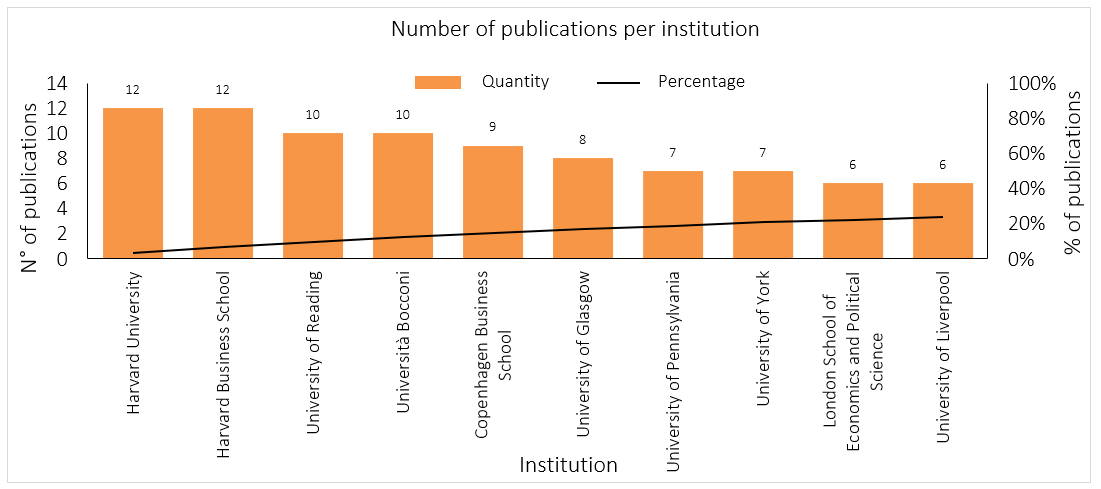 Regarding the most productive institutions in the field, Figure 5 presents the ten universities with the highest number of publications (of the 160 that report publications in Scopus), which account for 22.98% of the total production. As seen, Harvard University and Harvard Business School are on the top of the list, with 12 publications each, followed by the University of Reading and Universita Bocconi, with 10 publications each. Copenhagen Business School is in third place, with 9 publications.