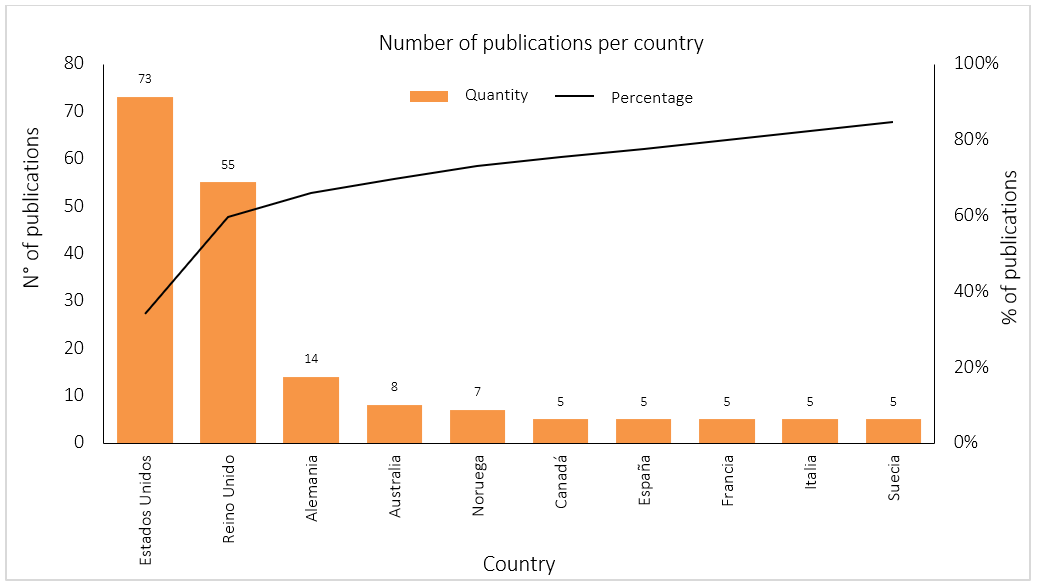 Furthermore, the bibliometric analysis revealed that there are 29 countries with publications on the matter, of which 27.59% produce 80% of the total publications. This suggests that this indicator is within the acceptable limits to comply with the Pareto principle. As observed in Figure 6, the United States is the most productive country with 73 publications, followed by the United Kingdom with 55 publications, and Germany with 14 publications. In addition, the ten most productive countries were found to produce 85% of the total publications, and 41.37% of the countries were found to have two or fewer publications. This means that knowledge is not dispersed but rather is evidently concentrated on certain countries. Importantly, the most productive countries in the field of business history are classified as developed, which emphasizes the importance of this discipline.