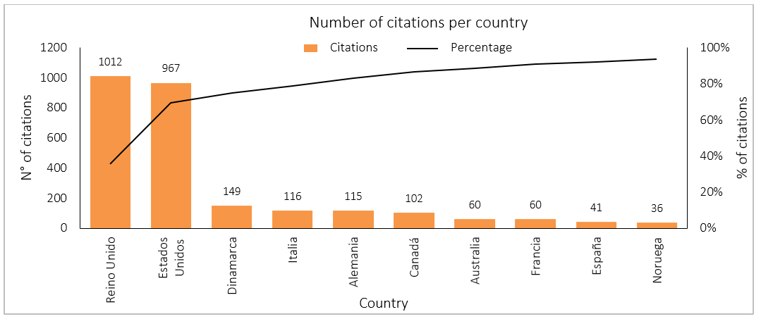 Finally, Figure 9 shows the ten countries with the highest number of citations in the field. As observed, the United Kingdom is the most cited country with 1012 citations, followed by the United States with 967 citations, Denmark with 149 citations, and Italy and Germany with 116 and 115 citations, respectively. When the rankings of the most productive and most cited countries were compared, the United States, the United Kingdom, Italy, Germany, Canada, Australia, France, and Spain appeared in both lists, making them the most representative and influential in the field of business history.