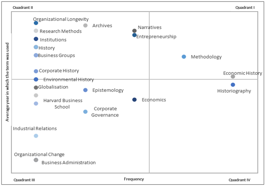 Then, there is Quadrant II, which contains the terms that, although not the most often used now, are among the most recent or emerging terms, that is, those that have recently been the subject of investigations. In this case, such terms are organizational longevity, archives, research methods, institutions, history, business groups, corporate history, narratives, entrepreneurship, and environmental history.