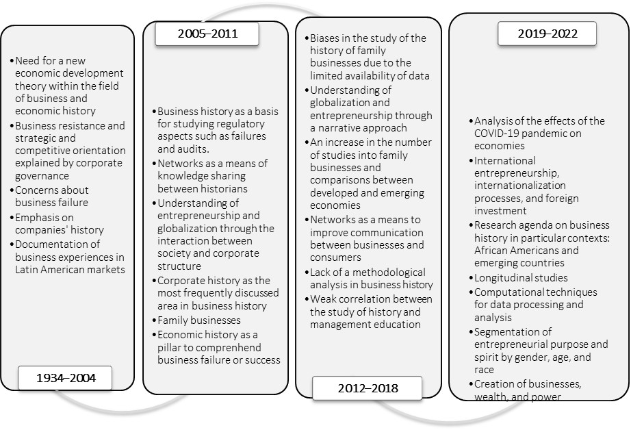 With respect to the evolution of the business history field, numerous topics have been addressed throughout the years, which demonstrates the breadth of the area and the multiple approaches to be studied. Originally, the topics were centered on the need for an economic development theory within economic and business history; then the focus shifted to corporate history. However, in recent years, researchers have shown interest in networks to improve communication between organizations and consumers, internationalization, and the effects of COVID-19 on companies.