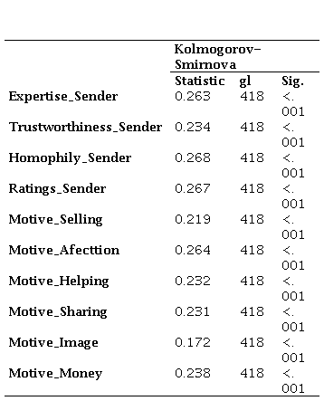 Source: Authors’ own work, 2022. Results obtained from the SPSS statistical program. Lilliefors significance correction.Tabla 2. Análisis de validez convergente. Pruebas de KMO y esfericidad de Bartlett y carga factorial