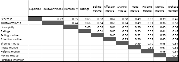 Video tutorial sender motive was also related to centennials’ purchase intention. The motives with the greatest correlation strength were authentic love for the product or brand (motive_affection Ṯ = 0.508 p<0.001), desire to share (motive_sharing Ṯ = 0.477 p<0.001), and desire to help others (motive_helping Ṯ = 0.470 p<0.001). This is consistent with the results of Jiang (2018), who found that these factors reduce consumer resistance to being persuaded.