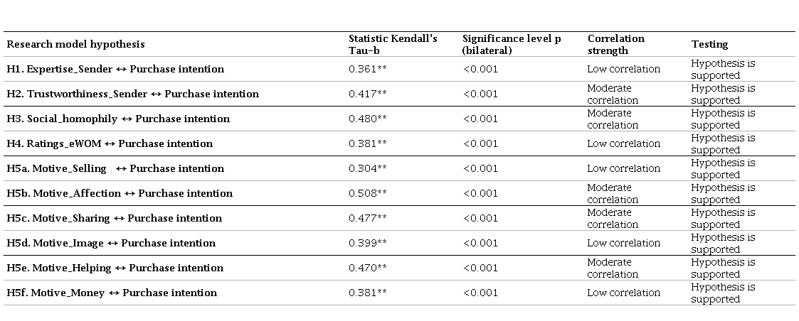 Analyzing the informational factors that determine source credibility, it is worth highlighting sender trustworthiness, which presented a moderate correlation with purchase intention (Ṯ = 0.417 p<0.001). This means that there is a relationship between the intention of purchasing the recommended products and the sender perceived trustworthiness among centennials, which confirms the model proposed by Hovland et al. (1953) and the findings of Lis (2013).