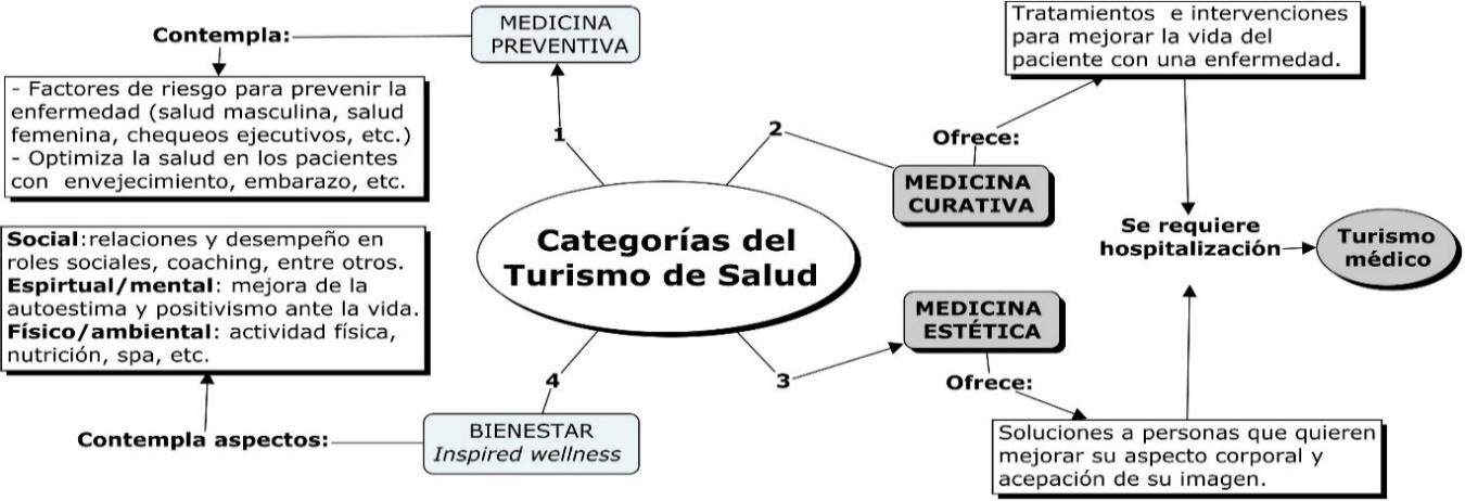 La Organización Mundial del Turismo (OMT, 2017) define al turista como cualquier persona que se desplaza de su lugar de trabajo o de vivienda habituales por más de veinticuatro horas, y, en el caso del turista de salud, el motivo principal de su desplazamiento es mejorar su salud con procedimientos médicos y/o actividades de bienestar y, además, tener experiencias relacionadas con el conocimiento y disfrute de los productos turísticos del lugar de destino, especialmente basados en la riqueza natural, cultural, eventos, compras, entre otros. En la Figura 1, se relacionan las categorías del turismo de salud.