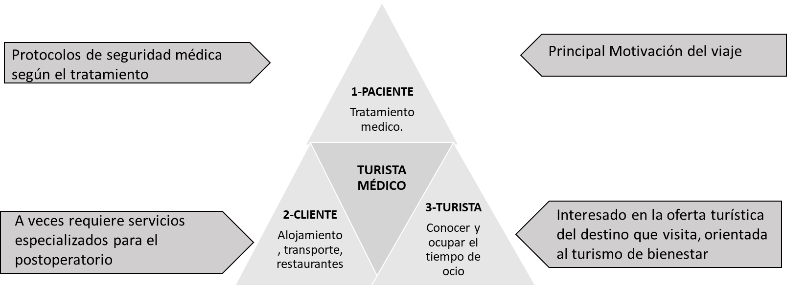 Fuente: elaboración propia, a partir de López et al., (2019).Como paciente, su principal motivación de viaje es recuperar la salud mediante una cirugía curativa o mejorar el aspecto mediante una cirugía plástica. En ambos casos, el servicio contempla protocolos médicos especializados que garanticen la seguridad del paciente. Como cliente, requiere satisfacer necesidades de alojamiento, transporte y restauración especiales, según su estado de salud, y como turista, desea conocer el destino que visita y ocupar el tiempo de ocio en actividades acordes a su estado de salud que, además, favorezcan su recuperación, como puede ser la oferta del turismo de bienestar, solicitado en los procesos postoperatorios. Por su parte, los acompañantes que generalmente viajan con el paciente requieren servicios turísticos acordes con su condición, por lo que se dinamiza el turismo en general en el destino (López et al., 2019).