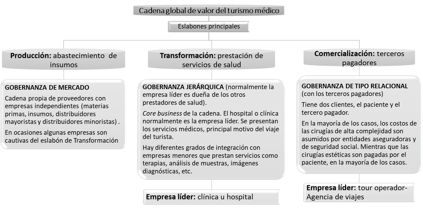 La cadena de turismo médico es una CGV, porque varios de sus eslabones están deslocalizados, es decir, están ubicados fuera del país donde se presta el servicio, como son algunas agencias de viaje, las aseguradoras que costean ciertos tratamientos de cirugías reconstructivas y las empresas aéreas, entre otras organizaciones que median entre el turista-paciente y la institución prestadora del servicio médico en el lugar de destino. Los clientes, en su mayoría, provienen de países extranjeros atraídos por los costos y la calidad del servicio (Sarwar et al., 2012). En este escenario, los turistas médicos son personas con aceptable capacidad de pago que se desplazan acompañados de familiares al lugar de destino para someterse al procedimiento médico y en los lapsos de pre y posoperatorio, y que disfrutan de otros productos turísticos del destino (Banco de Desarrollo Empresarial de Colombia y SIGIL Consulting Group, 2015; López et al., 2017).