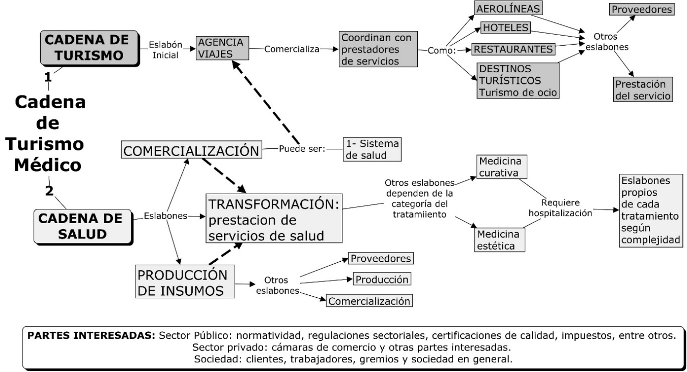 Desde el punto de vista económico, (Bastidas-Goyes et al., 2021; De la Puente, 2015; Ramírez-Sierra, 2021; Ramírez-Montañez, 2016; Villa-Hernández et a.,2021) afirman que, aunque tiene un considerable grado de subjetividad en cuanto a la satisfacción del cliente por la intangibilidad de los servicios turísticos, también es cierto que su crecimiento es alto por el surgimiento de una clase social con recursos que busca el mejoramiento de la salud y la estética corporal. Sin embargo, la calidad y credibilidad de las instituciones médicas y la organización de todos los eslabones de la cadena en su conjunto generan el reconocimiento y posicionamiento del destino. Para Beltrán Gil et al. (2017); De la Puente (2015); González-Mendoza y Fonseca-Vigoya (2016); López et al. (2017), la diversidad de actores de la cadena (aseguradoras de salud, instituciones prestadoras de servicios médicos, agencias de viaje, transporte, hoteles, restaurantes y otras ofertas turísticas), se articulan como cadenas globales de valor y pueden generar un efecto positivo para la sostenibilidad apoyado por estándares internacionales.