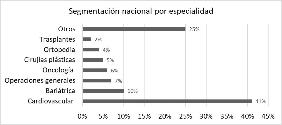 Por otra parte, la segmentación del mercado, de acuerdo con la demanda de servicios médicos de los turistas, evidencia que la mayoría de los pacientes buscan tratamientos cardiovasculares en un 41%, seguido por tratamientos bariátricos, con 10%, oncología, operaciones generales, cirugías plásticas, ortopedia, trasplantes y otros tratamientos no superan el 7% (Arcila y Giraldo, 2019; Causado-Rodríguez et al., 2018), como se aprecia en la Figura 6.