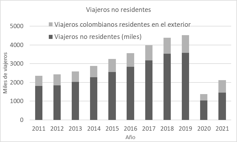 Fuente: elaborado a partir de MinCIT (2022).De la Figura 7 se concluye que el crecimiento promedio anual de la llegada de viajeros del exterior a Colombia fue del 8,6%, antes de la pandemia del COVID 19, pero decreció el 69,5% en el 2020, respecto al año anterior 2019, debido a las restricciones de movilidad. En 2021, la recuperación con respecto a 2020 fue del 53,6%, pero aún no alcanza los niveles de 2019 por las mismas causas. El comportamiento de la llegada de no residentes en 2021 estuvo por debajo (-53,1%) con respecto a 2019, pero se espera una recuperación cercana a las cifras de 2019 para el año 2022 (MinCIT, 2022).