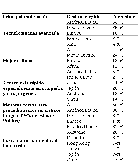 Con el tiempo se ha creado cierta reputación en lugares estratégicos, lo cual ha derivado en destinos turísticos especializados. Para el caso de turismo de salud hay dos escenarios, el primero, relacionado con la infraestructura para prestación de los servicios de salud, y el segundo, relacionado con el entorno, es decir, con los atractivos naturales y paisajísticos que favorecen la recuperación de la salud de los pacientes y el disfrute de los acompañantes. Esto convierte la experiencia del turismo médico en un turismo integral con turismo de naturaleza, turismo etnográfico y en ocasiones turismo de compras (González-Mendoza y Fonseca-Vigoya, 2016). Los destinos mundiales más reconocidos y visitados por turistas internacionales, según sus fortalezas se relacionan la Tabla 3.