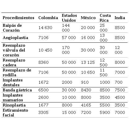 En cuanto a los costos, también el turismo médico en Colombia tiene ventaja competitiva como se muestra en la Tabla 4, donde se observa que el país tiene costos más bajos con respecto a los principales competidores. El porcentaje de los costos de los servicios médicos en Colombia son sensiblemente más bajos con respecto a los Estados Unidos, como se muestra en los siguientes ejemplos: baipás de Corazón, 10,2%; angioplastia, 12,5%; reemplazo válvula del corazón, 6,1%; reemplazo de cadera, 16,7%; reemplazo de rodilla, 14,2%; implantes dentales, 83,6%; banda gástrica, 21,7%; implantes mamarios, 26%; rinoplastia, 21% y estiramiento facial, 22%. Los costos de los servicios ofertados en Colombia son desde 78% a 94% más bajos con un alto nivel de calidad, por lo que el turismo médico va ganando espacios dentro de la oferta turística nacional e internacional (Causado-Rodríguez et al., 2018; González-Mendoza y Fonseca-Vigoya, 2016).