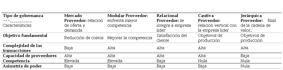 Fuente: elaboración propia, a partir de Jiménez Barrera (2018).Aquí se observa que el tipo de gobernanza se deriva del papel que juega la empresa líder sobre los demás eslabones de la cadena. De acuerdo con las condiciones de cada país o región, la gobernanza cambia para adecuarse a las condiciones del mercado (Arcila y Giraldo, 2019; Martínez Garcés y Padilla Delgado, 2020; Martínez-Chaves, 2016; Montalvo Gómez, 2020; Triviño Orozco et al., 2018).