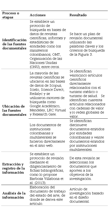 El marco teórico contempla, por una parte, el turismo médico como actividad económica con particularidades sobre otras formas de turismo porque integra el clúster médico y la cadena turística y, por otra, la cadena global de valor (CGV), que partir de la globalización de los mercados traspasa fronteras de países, regiones y continentes (Xie et al., 2019), con las consecuentes complejidades de una cadena de suministro trasnacional. En la metodología se explica el proceso sistemático del diseño documental que provee la información para realizar el análisis cualitativo del objeto de estudio (cadena global del turismo médico en Colombia). La discusión de resultados presenta, en primer lugar, el contexto del turismo médico como una rama del turismo de salud, su evolución y desarrollo; en segundo lugar, se analizan las cadenas globales de valor como un fenómeno económico que surge de la globalización y que obliga a modernizar las cadenas de suministro con tecnología e innovación para satisfacer la demanda del mercado; en tercer lugar, se analiza la creación de la ventaja competitiva basada en las cinco fuerzas del diamante de Porter y, finalmente, se hace una descripción del impacto generado por la pandemia del SARS-CoV2 en el mundo y en el país, y se exponen las políticas para la recuperación del sector en la postpandemia y las proyecciones de recuperación del turismo.