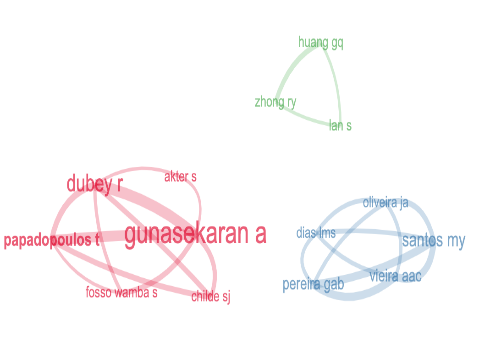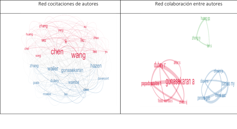 Fuente: elaboración propia.Dentro del procesamiento de la información se realizó una revisión de cocitaciones y la cooperación entre autores. En el proceso de elaboración de las redes se aplicó Bibliometrix, que utiliza los resultados obtenidos de las fuentes y cruza la información a fin de evidenciar la red en la que estos trabajan. Para el caso de big data se encuentran tres grupos en los que destaca el compuesto por Gunasekaran como autor más relevante en el tema dado por la cantidad de citaciones de sus publicaciones, acompañado de Papadopoulos, Dubey, Fosso, Childe y Akter, casi todos incluidos en la lista de los diez autores con más documentos publicados que los pone como una red de referente a las demás por el dominio del tema que en este grupo tiene. En otro de los grupos se hallan autores que conforman el top encontrando como principal a Santos, acompañado de Pereira, Viera, Dias y Oliveira. En el tercer grupo están los autores del continente asiático, representados por Huang, Zhong y Lang, lo cual se observa en la Figura 4.