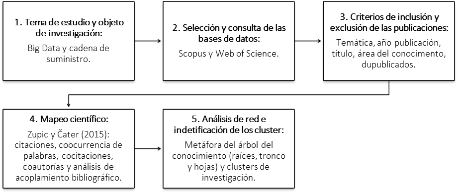 Con los tres indicadores mencionados se realizó la red de citaciones, para definir la estructura de la metáfora del árbol del conocimiento sobre big data implementado en la cadena de suministro, en conjunto con la visualización y discusión de los clústeres de investigación (Gurzki y Woisetschläger, 2017; Zuschke, 2020).
