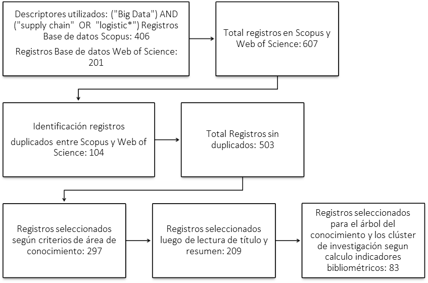 Fuente: elaboración propia.Los criterios de consulta arrojaron un total de 503 registros consolidados después de integrar los 201 registros de Web of Science y los 406 registros de Scopus, eliminando los datos duplicados. Para ampliar la cobertura de las bases de datos empleadas, se incluyeron términos como big data, supply chain y logistic en diferentes idiomas (inglés, chino, francés y portugués). Como resultado, se observó que el 98,41¬% de las publicaciones encontradas en Web of Science y Scopus estaban en inglés, mientras que el 1,59¬% restante se encontraba en chino, francés y portugués, lo que evidencia el predominio del idioma inglés en las bases de datos consultadas. Esta información es relevante para tener una visión más completa de los documentos consultados (Vera-Baceta et al., 2019).
