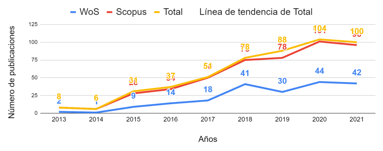 Los resultados indican que los trabajos e investigaciones sobre el tema comenzaron a partir de 2013, y en los últimos cinco años se ha producido el 83,70¬% de los artículos, lo que demuestra el alto interés que el tema ha generado en profesionales y en el sector académico debido al impacto que puede tener en las empresas. Esto se muestra en la Figura 3.