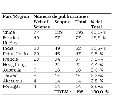 Fuente: elaboración propia.En la Tabla 2 se presentan los resultados de los diez países con mayor producción de literatura en la investigación sobre big data, cadenas de suministro y logística. Los datos fueron filtrados y organizados en orden secuencial según el número de publicaciones de cada país hasta la fecha. Se observa que, de los diez primeros países, cuatro pertenecen al continente asiático, lo que demuestra su alta incidencia en los procesos investigativos sobre big data. Estos países asiáticos generan el 58,3-% del total de los artículos encontrados en la investigación. Adicionalmente, se destaca que China es el país que más contribuye a esta temática, aportando el 40,1¬% del total de publicaciones.