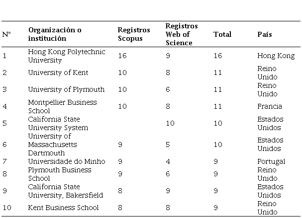 Fuente: elaboración propia.En el apartado de afiliaciones, se presentan las diez instituciones con mayor cantidad de publicaciones en Web of Science y Scopus. La Hong Kong Polytechnic University lidera este ranking con una producción de dieciséis artículos sobre el tema de big data. Las primeras seis instituciones en esta lista tienen al menos diez publicaciones en este campo, lo que indica el interés de la academia en este tema, debido a la creciente necesidad de profesionales en esta área. En cuanto a la colaboración entre países, se destaca la fuerte relación entre China y Australia, Hong Kong y EE. UU., mientras que el Reino Unido ha establecido vínculos con India, Turquía y Sudáfrica. Estos hallazgos se muestran en la Tabla 3.