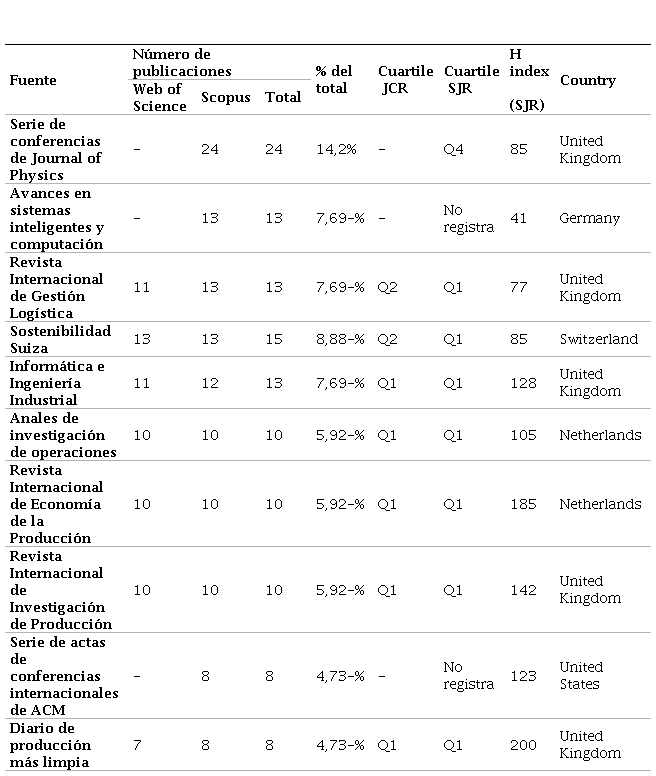 Fuente: elaboración propia.Después de comparar la información, se observó que las revistas preferidas por los autores para publicar sus trabajos son del Reino Unido. De hecho, cinco de las diez principales revistas en esta lista son de allí, encabezada por la Serie de Conferencias del Journal of Physics con un 14,20¬% del porcentaje total considerado para este ejercicio. Si se suman las publicaciones de estas cinco revistas, representan el 40,24¬% del total de las publicaciones sobre la temática. Es importante destacar que casi todas las revistas de la lista se encuentran posicionadas en los primeros cuartiles SJR de medición, ubicándolas en Q1, con siete de las diez revistas en este cuartil. Es interesante anotar que, aunque la mayor producción sobre la temática se asocia con países del continente asiático, las revistas más relevantes no están necesariamente asociadas a ellos. La caracterización de las principales revistas se presenta en la Tabla 4.