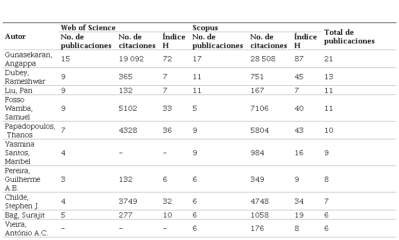 En la Tabla 5 se aprecia una diferencia notoria en la cantidad de publicaciones de Gunasekaran, Angappa, de la Universidad Estatal de Pensilvania-Harrisburg, que encabeza con un total de veintiuna, comparado con los demás autores de la misma adicional que el número de citaciones que tiene el autor, 28 508 en Scopus y 19 092 en Web of Science, e índice H de 87, lo evidencian como uno de los académicos que más ha realizado aportes y de mayor domino de la temática, haciéndolo un referente en todos los ejercicios académicos de investigación.