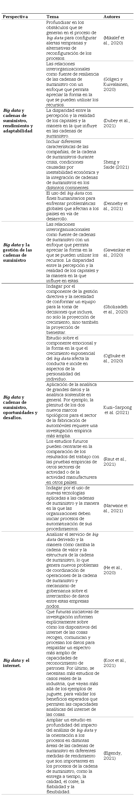 En relación con las cadenas de suministro, la literatura previa ha abordado temas como el impacto de la analítica y la integración en la toma de decisiones organizacionales (Wang et al. 2016), la importancia de la transformación y el cambio en las actividades comerciales de las organizaciones (Shen y Chan, 2017), y la estructuración de revisiones en los mecanismos y tendencias que otros autores han investigado en big data y las industrias 4.0 (Chalmeta y Santos-deLeón, 2020). Estas revisiones impulsan a la academia a extender los procesos de investigación para abordar los desafíos y exigencias actuales de las organizaciones.
