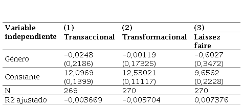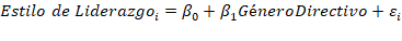 Donde, Estilo de Liderazgoi corresponde a uno de los tres estilos de liderazgo evaluados en el instrumento, β son los parámetros del modelo, Género del Directivo es una variable dummy que toma el valor de 1 si el directivo de la universidad es mujer y cero si es hombre, Ei el término de error aleatorio del modelo, como se presenta en la Tabla 7: