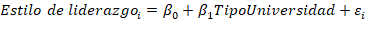 Para evaluar el efecto que tiene el tipo de universidad sobre los estilos de liderazgo, se estima el siguiente modelo (ecuación 4) de regresión lineal: