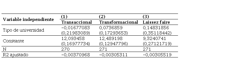 Fuente: elaboración propia Nota: errores estándar entre paréntesis (*): p<0.05;(**): p<0.01Al igual que el análisis bivariante de los estilos de liderazgo según el género del directivo, los resultados reportados en la Tabla 10 evidencian que no se presentan diferencias significativas de los estilos de liderazgo según el tipo de universidad (p>0,05). De acuerdo con lo anterior, estos modelos permiten complementar los resultados descriptivos de las medias de los estilos de liderazgo, en los que también se evidencia que no existe diferencia significativa de los estilos de liderazgo según el género del directivo y el tipo de universidad. En este sentido, se encuentra que las Hipótesis 5 y 6 estuvieron en la dirección esperada, pero los resultados no son significativos (p>0,05), por lo cual se rechazan.